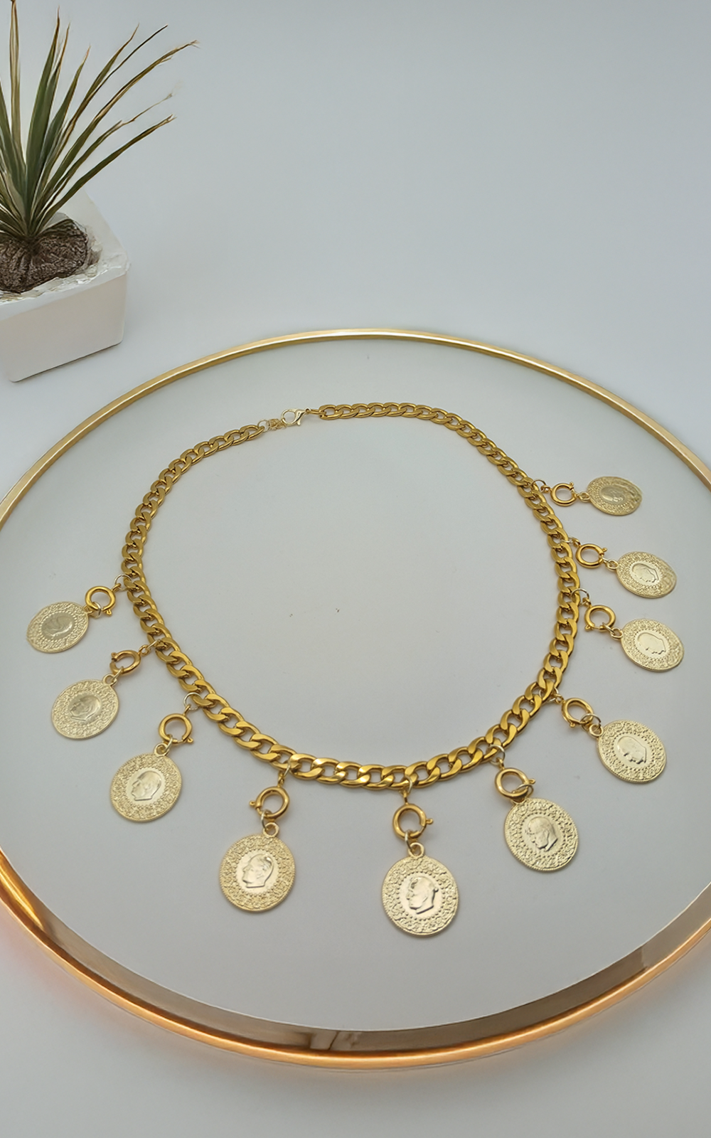 Kopya çeyreklerle gönderilir, dilerseniz kendi altınlarınızı takabilirsiniz. 60-65 cm ayarlanabilir uzunluk.